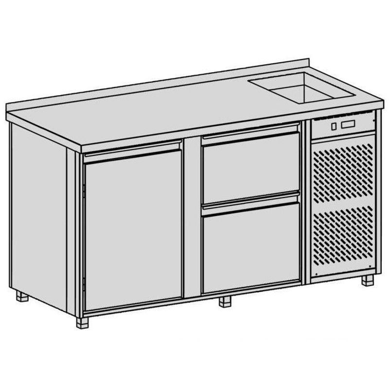 Chladiaci pult na nápoje, rozmer (ŠxHxV) 1630x700x900 mm, kapacita 449 l, príkon 332 W, pohyblivá polica na nápoje ▪ 2x zásuvka na nápoje ▪ teplotný rozsah +2°C / +8°C pri okolitej teplote max. 32°C ▪ napájanie 230V / 50Hz ▪ chladiaca vaňa, chladiace médium R134a, nasávanie a výfuk spredu