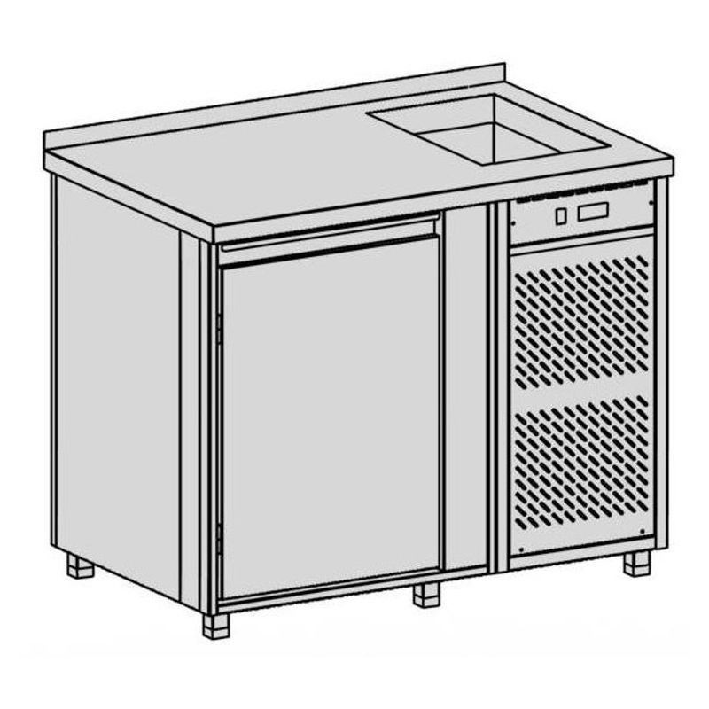 Chladiaci pult s vaňou, rozmer (ŠxHxV) 1100x700x900 mm, kapacita 240 l, príkon 333 W, pohyblivá polica na nápoje ▪ teplotný rozsah +2°C / +8°C pri okolitej teplote max. 32°C ▪ napájanie 230V / 50Hz ▪ chladiaca vaňa, chladiace médium R134a, nasávanie a výfuk spredu