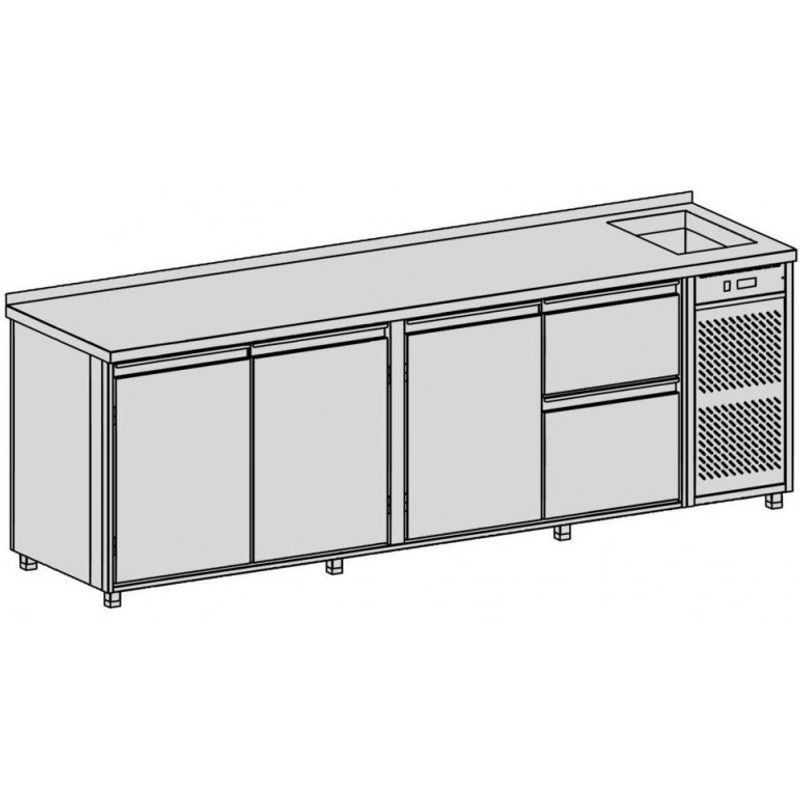 Chladiaci pult s vaňou, rozmer (ŠxHxV) 2690x700x900 mm, kapacita 869 l, príkon 480 W, pohyblivá polica na nápoje ▪ 2x zásuvka na nápoje ▪ teplotný rozsah +2°C / +8°C pri okolitej teplote max. 32°C ▪ napájanie 230V / 50Hz ▪ chladiaca vaňa, chladiace médium R134a, nasávanie a výfuk spredu