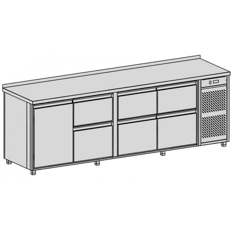 Chladiaci pult na nápoje, rozmer (ŠxHxV) 2690x700x900 mm, kapacita 869 l, príkon 480 W, pohyblivá polica na nápoje ▪ 6x zásuvka na nápoje ▪ teplotný rozsah +2°C / +8°C pri okolitej teplote max. 32°C ▪ napájanie 230V / 50Hz, chladiace médium R134a, nasávanie a výfuk spredu