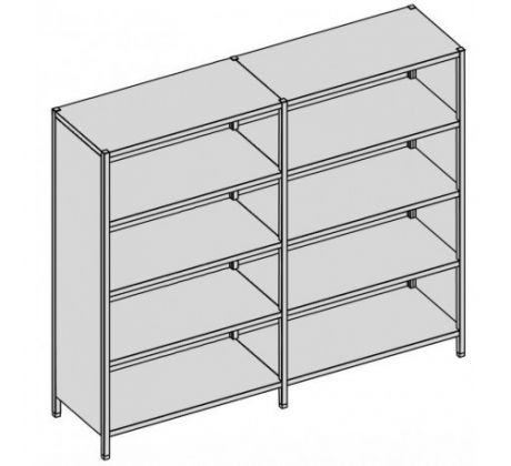 šírka 2300 mm, výška V=1700 mm (-10+20 mm), 5 x polica s výstuhou, nosnosť police 50 kg/1 polica, krytovanie, 6 nôh