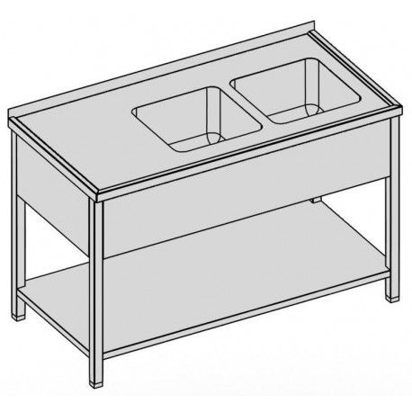 šírka 1600 mm, výška V=850 mm (-10/+25 mm), zadný lem 40 mm, zadné nohy odsadené 25 mm, 2 x drez 400x400x250 mm, kryt, polica vo výške 150 mm, nosnosť police 50 kg/1 polica