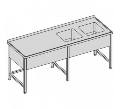 šírka 2000 mm, výška V=850 mm (-10/+25 mm), zadný lem 40 mm, zadné nohy odsadené 25 mm, 2 x drez 400x400x250 mm, kryt